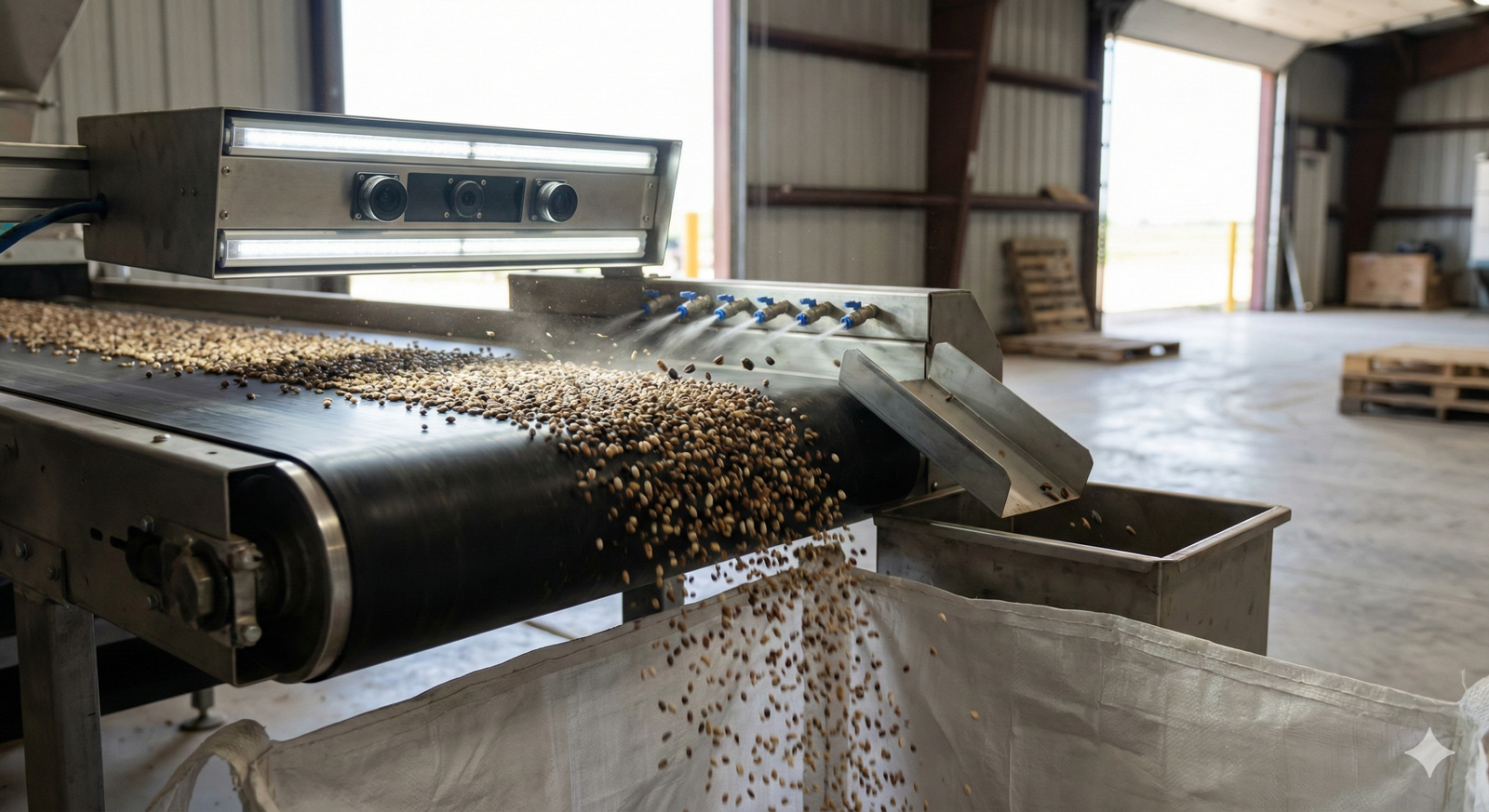 Le processus s’organise en trois étapes complémentaires. Le tamisage/criblage élimine d’abord les impuretés et éléments indésirables par séparation dimensionnelle. Le lot est ensuite traité sur table densimétrique, permettant un tri par densité afin d’écarter les éléments trop légers ou non conformes. Enfin, le tri optique vient affiner la sélection : des caméras détectent les défauts et corps étrangers pour garantir une qualité constante.